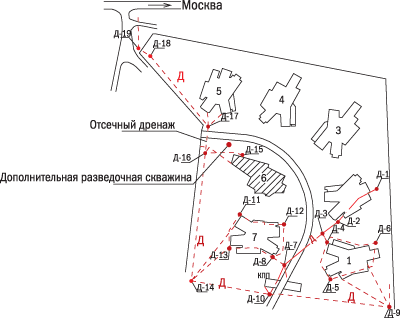 Pagal užduotį генподрядчика specializuota projekto organizacija sukūrė " renginių apsaugos pastatų поселка nuo подтопления грунтовыми vandeniu (pav. 2). Jis apima prietaisas horizontali отсечного drenažo, esančios aukščiau поселка, ir vietos apsaugą pastatų, naudojant пристенных ir лучевых дренажей. Tačiau dėl sudėtingų inžinerinių-geologines sąlygas ir artimo vietą водоупора, kad pasiūlyti sprendimai nėra užtikrintas apsaugą nuotolinio kotedžai nr. 5 ir 6 pav. 2) nuo подтопления.