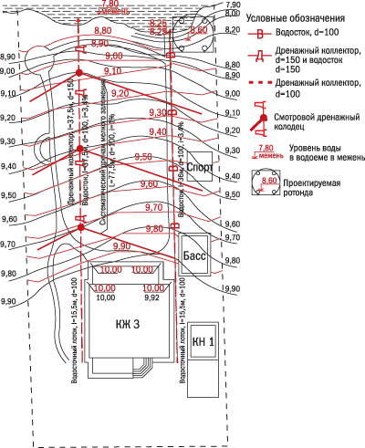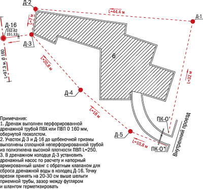 Papildomos apsaugos, sklypo ir pastato nuo верховодки buvo taikoma klasikinė schema - sisteminis drenažo благоустраивается teritorija ir контурный водосток paviršinių vandenų, kamšalu, aplink perimetrą цокольной pastato dalys (pav. 6). Į пониженном vietoje, kairėje pusėje išilginės sklypo eina būrys дрена D = 150 mm, trijose vietose intervalais 12, 5 m į jį врезаются dvi дрены-осушители D = 100 mm. Tarnybiniai horizontali drenažo toks pat, kaip ir ankstesniame pavyzdyje. Reset дренажных ir atmosferos vandenų į kūdrą per kamerą-отстойник ir гравийную фильтрующую призму. Tiesieji похили дрен-осушителей per 1% pavyko užtikrinti sąskaita косого vietos atžvilgiu išilginės ašies дрены-собирателя.