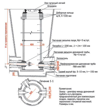 Dėl kateterio drenažo trasoje rengia stebėjimo (ne rečiau kaip po 50 m.) ir pasukama šulinių iš surenkamų gelžbetoninių elementų. Pokytis aukštumas tarp лотками отводит ir veda дрен - ne mažiau kaip 10 mm, o šulinio dugnas turi būti pasirūpinta tuo siekė 200-300 mm žemiau lovelio priėmimo дрены prietaiso приямка-грязеуловителя (pav. 4).