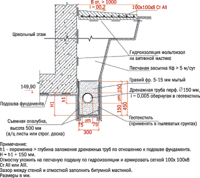 Svarbų vaidmenį vaidina отмостки pastatai, kuri rengiama plotis ne mažiau kaip vieno metro į песчаной rengiant storis 15-20 cm, su vienu arba dviem sluoksnių гідроізоляці.
