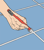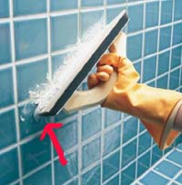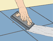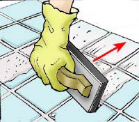 Kai visi швы bus užpildyti, jei norite ištrinti papildomų затирки jums reikės терка, kurią reikia laikyti po beveik tiesioginis kampu į paviršių plytelių (kaip parodyta paveikslėlyje). Tokiu atveju reikia judinti терку įstrižai gana siūles, kitaip kraštas priemonė gali patekti į hermetiškas ir pašalina iš jo dalį затирки. (Jei tai atsitiks, tiesiog pridėkite šiek tiek затирки į hermetiškas ir išlyginkite paviršių siūlės krašto терки). Kaip tik perteklius bus pašalintas, suteikti galimybę затирке patraukti prie prieš pradėdami valyti. Kol jūs užsiimate затиркой ir valymą, reikia nepamiršti laikas nuo laiko перемешивать Затирочный misinys į ведре, kad jis likdavo m'kuriems iki padengimo jį į naujus vandenis.
